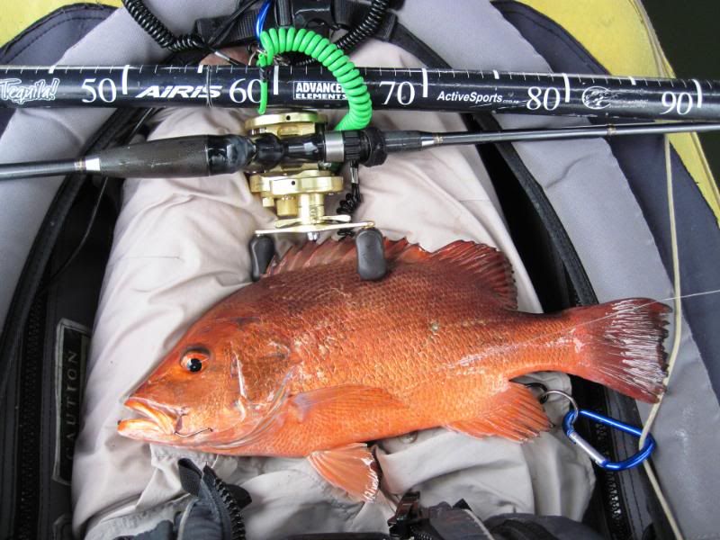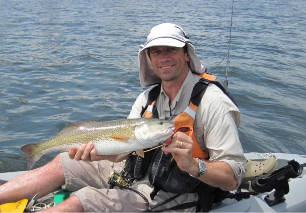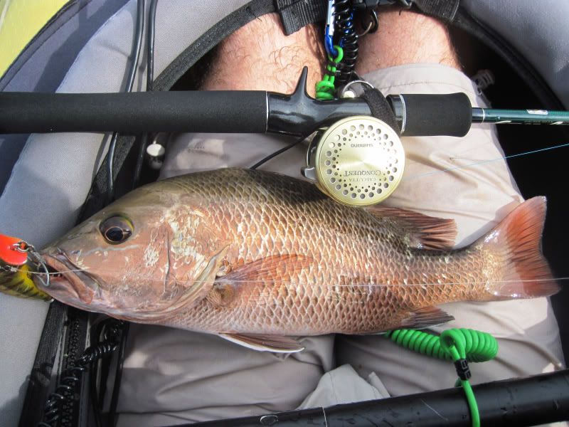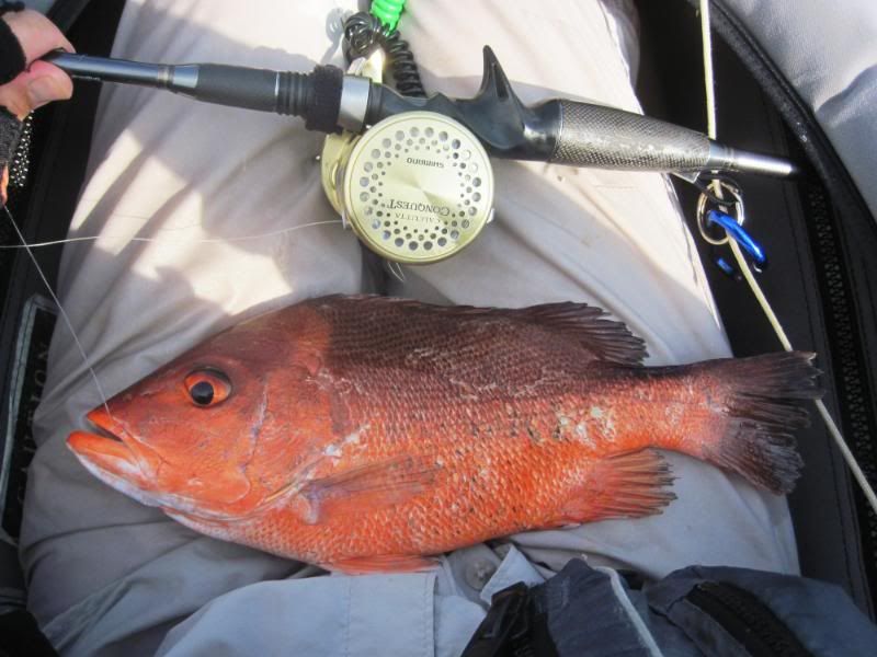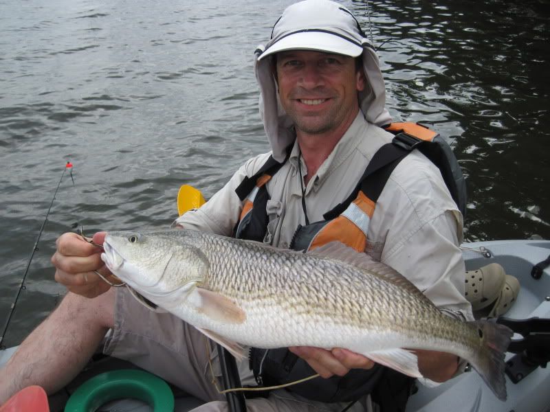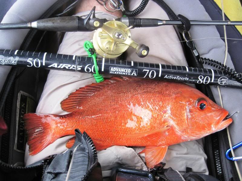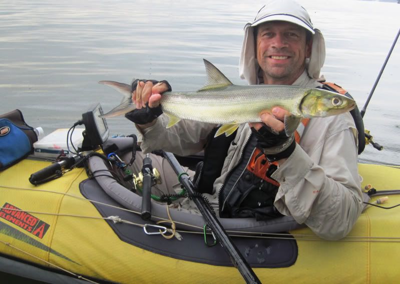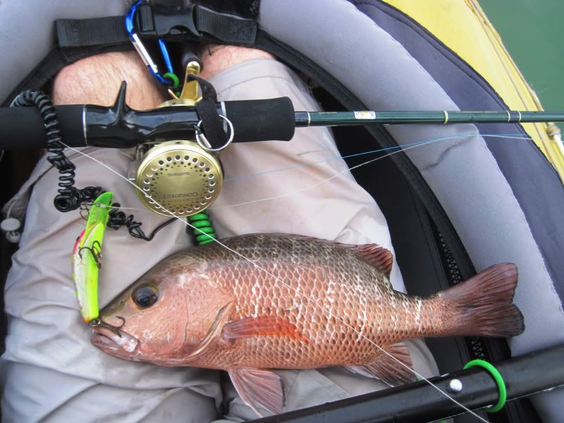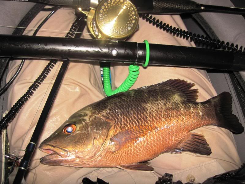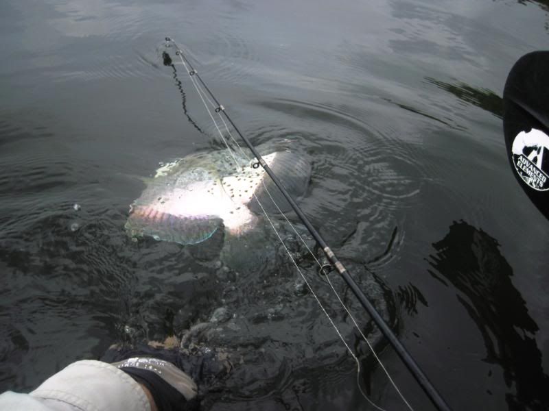 A while later, I thought I heard a distant call. Looked around and there was Merv, into the fight with a fishy beast. As I paddled toward him, I could see the fish jump a few times. Getting closer now and Merv was reaching down to get his prize.