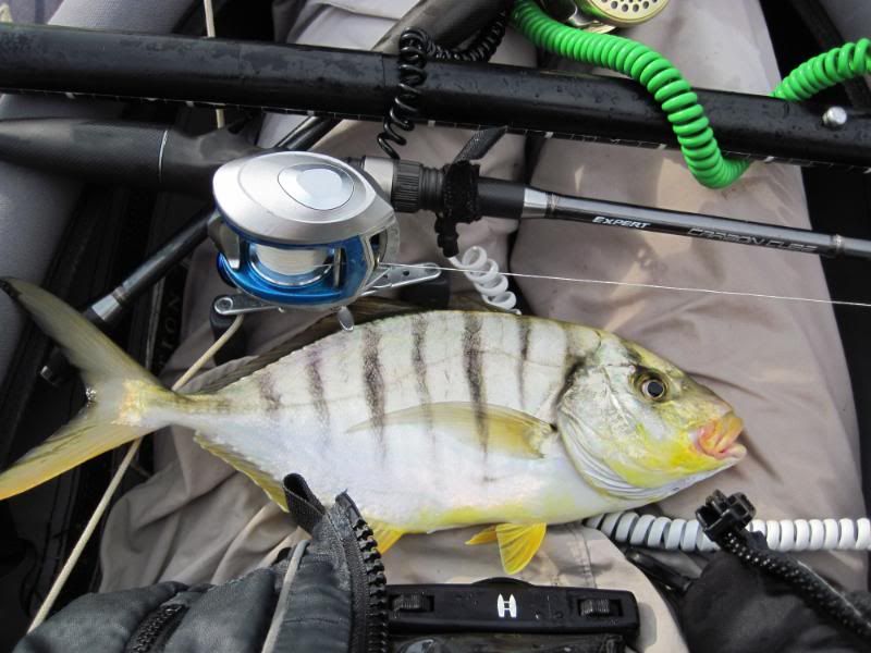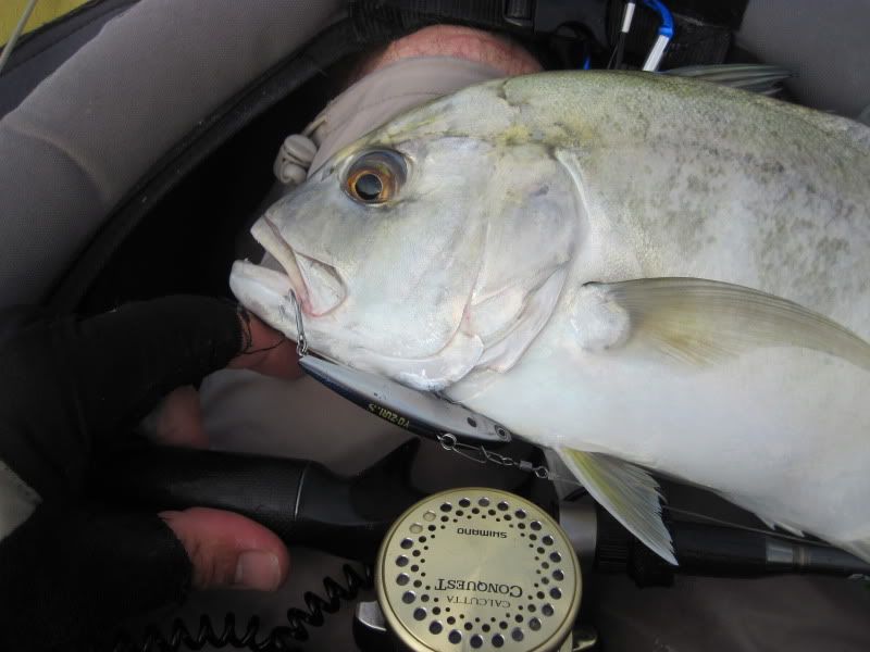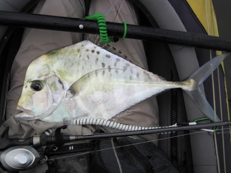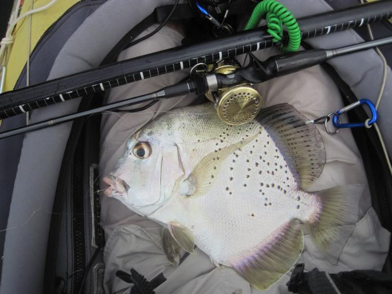 I switched rods and was delighted to feel a fighter on the line again. To my horror, the line went slack and I thought I’d lost it, but then a bar of silver sprang out of the water to my left. I wound line in as quickly as I could and the fish jumped again. Then she went down deep again, pulling off line against a fairly tight drag. Left, right, under the yak and back again.