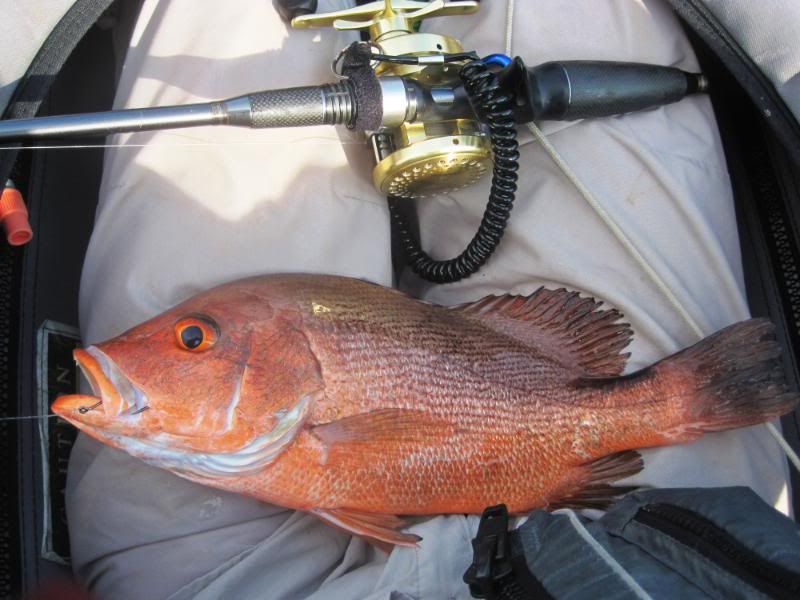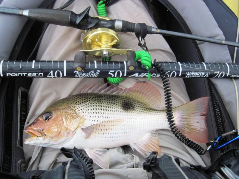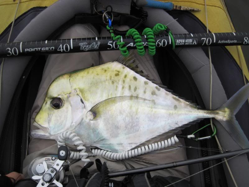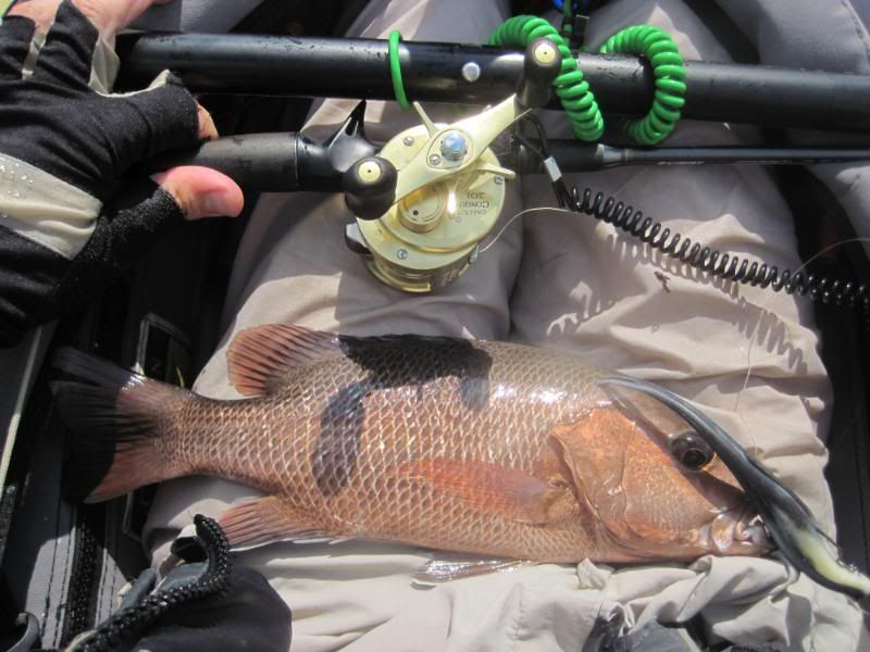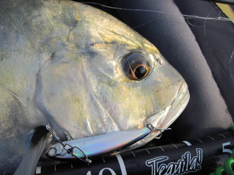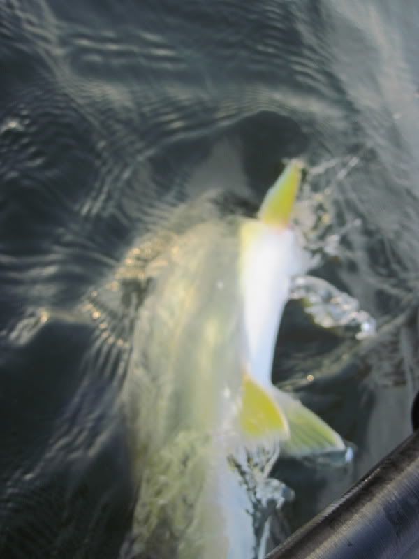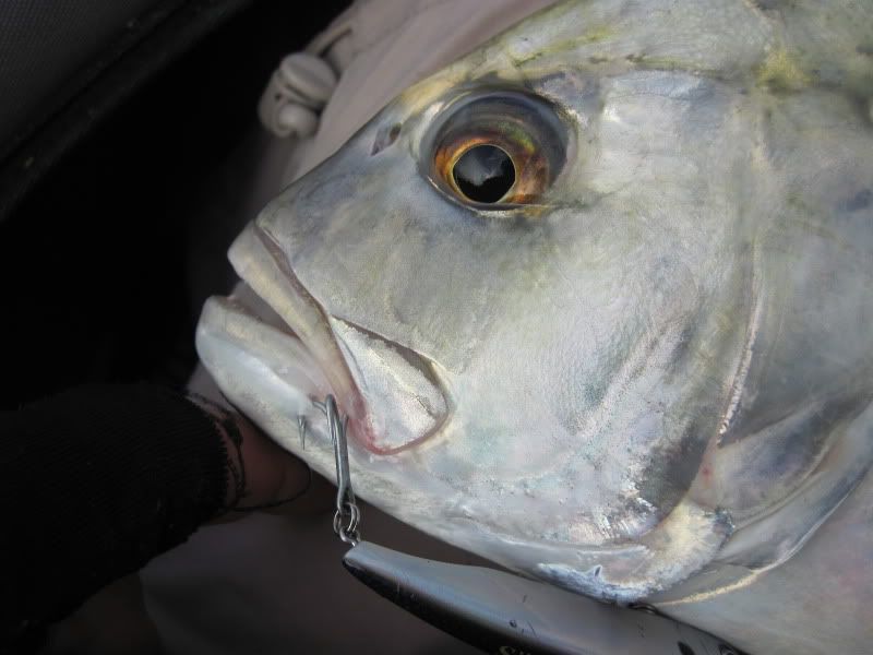 Then I saw her going toward the anchor rope and round she went. I thought I would lose her here for sure, but she stayed on and circled around in front of me as I lifted the rope. I nervously reached down and grabbed the line. Open wide and … GOTCHA!!! A lovely Queenfish held aloft!