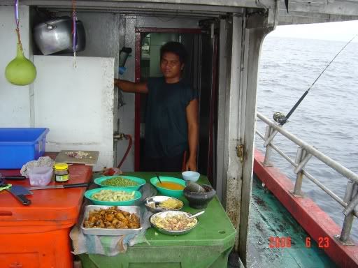 8:30pm hingga 1:00am…suasana di atas bot…ZZZZZEEETTTTTTTT…AAAhhhhhhhhhhhhhhhhhh…tarik keluar tarik keluar…cangkuk…cangkuk…oittttt mana pengetuk…Tekong!!! depan! depan!..oitttttt Belakang! belakang! ZZZEEETTTTTTTTT Sini! Sini!..cangkuk MANAAAAAAA!!! ZZZZZZZZZETTTTTTTTTTTT…AHHHhhhhhhhhhhhhhhh LAWANNNNNN!!! JIG! JIG! JIG!..aku nak pecah rekod jigging malam ni (kata AbeWang)…haiyooooo penat oooooo (kata tekong)…kita potong satu tenggiri buat bubur aaaa…kami pun kata BOLEHHHHHHHH!!! awak2 pun sambil sibuk guide ikan, ketuk kepala kasik mati, susun ikan, bersihkan darah dari lantai, tolong angkat reel yg mengganggu laluan larian tenggiri, sempat lagi masak Bubur Tenggiri yg saya rasa teramatlah SYIOKKKKKKK NYA…sambil suap bubur…ZZZZEEETTTTTTT…AAAHHHHHHHHHHHHHHHHHHH…ketar dah kepala lutut…dlm 1:30am..saya pun surrender & meneruskan perjuangan kat dlm kabin.