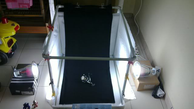 setelah itu saya letakkan lampu di tepi kiri dan kanan agar cahaya tertumpu di kawasan tengah light tent.