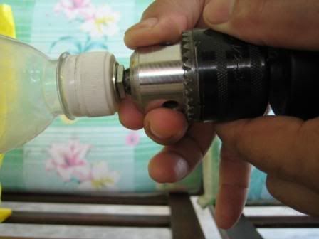In my case, I replaced the line stripper cap with another standard cap and punched a small hole on the cap and another hole under the base of the bottle. Then I inserted a long sturdy wire (I sacrificed my el cheapo steel spreader for this) through the holes! Now you have a simple spindle like creation. Ask someone to hold the spindle while you crank the line manually OR if you are doing solo like me, then put the spindle inside a shoebox (any cardboard boxes can do lah) and punch a tiny hole at the center of the box from where you run the line through and onto the spool.