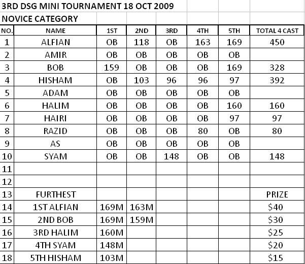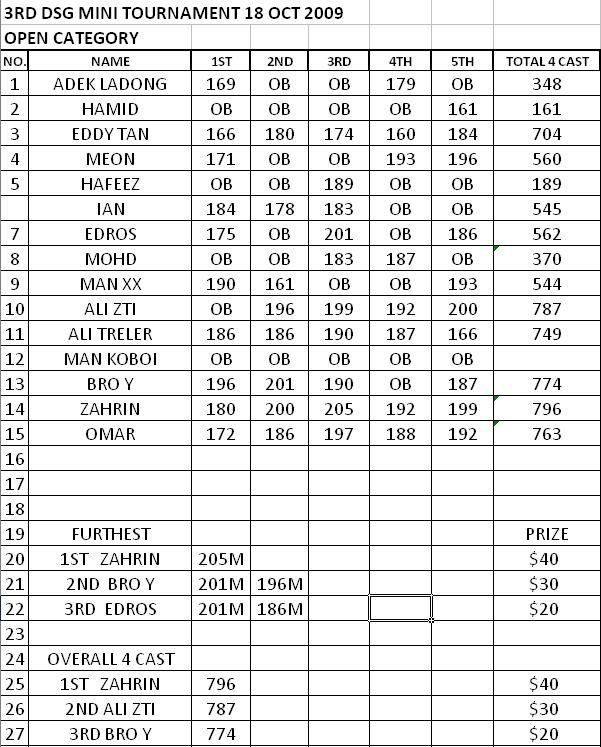 Congratulations to all the winners. Zahrain is still strong I see "she's the man" Eddie Tan very competitive, keep going sifu. To meon,hamid, adek and the rest, I hope to see all of you soon in the big tourny. Lastly, bro y "wah...you now very far arrrready... am proud of you" but watchout Ian is catching up. The number of novice participating is quiet encouraging. All of you guys are fantastic to keep the sport alive...hooray!!! for distance casting.
