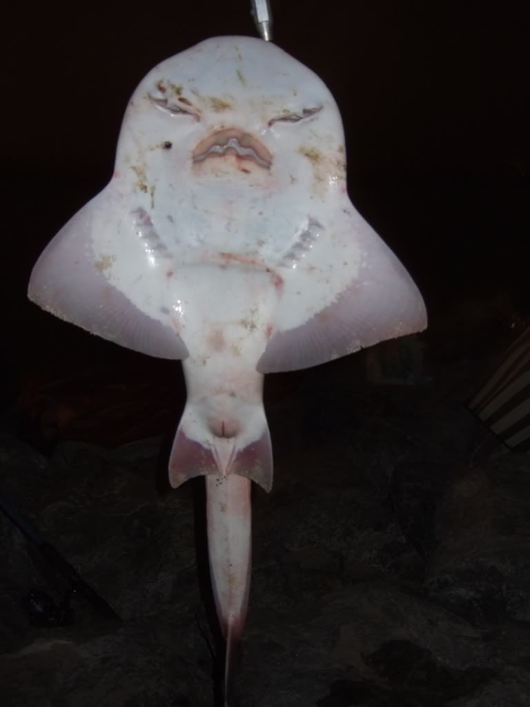 Maybe is Narcinidae - (Numbfishes) - Atlantic, Indian and Pacific Oceans. Head equipped with powerful electric organs, developed from branchial muscles. Eyes small. Well developed caudal fin. Dorsal fins 0-2. Skin soft and loose. Disc rounded anteriorly; jaws stout; strong labial cartilages; rostrum present.