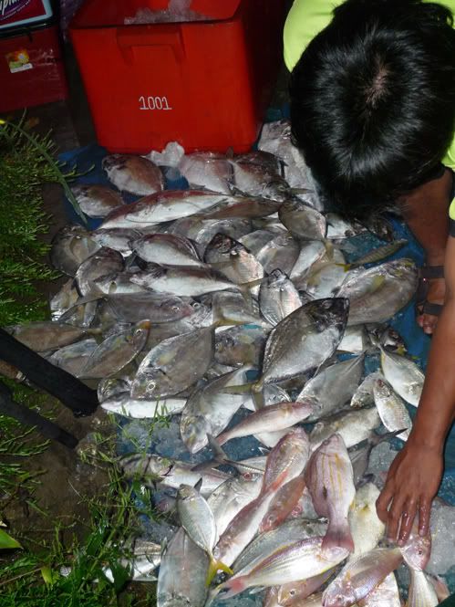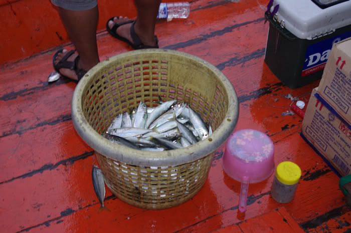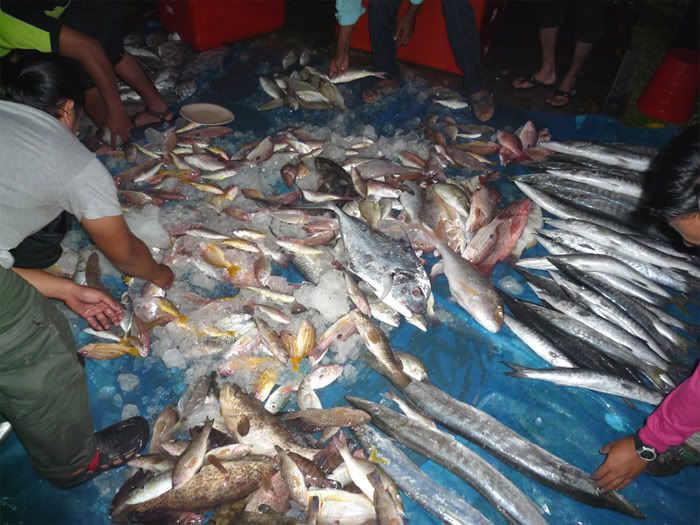 Bot Walad (tekong tersohor ni) dah lama menanti kat Jeti. Lebih kurang pukul 4 baru kami selesai memunggah barang ke bot. Selesa jugak bot ni. Ataih bumbung pun buleh tidoq. Cuma, rod holders yang dipasang jer rendah sangat. Jenuh nak strike ni. Pemandangan sekitar memang cun….macam nak pindah dok siam jer. Bot bertolak menuju pulau-pulau kecik yang berhampiran. Heran aku…takkan mancing kat sini kot? Rupanya rileks tunggu malam. Sauk sotong la. Dek kerana pemandangan yang indah, aku layan bersidai ataih kerusi saja laa…lambat lagi nak malam. Budi (awak2) pun memulakan proses menyediakan dinner. Dengaq kata sambai belacan dia buleh bikin angau. Malam tu kena tomyam ayam. Sambai belacan dia memang tip top. Fuuuhhhh!! Ingat sonang ke nak makan tomyam tengah laut?? Takder restoran terapong wooo tengah laut ni.
