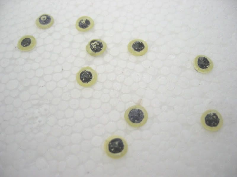 Hai ya guys. Predo ur eye backings & dots then after u coat ur lures whatever left over devcon u can then use for ur eyes. Dot ur eyes with sticker or paint be easier way to go. Else u can drip black epoxy by itself onto tiny nail heads first, do a batch then just collect these to put onto ur shiny stickers later.