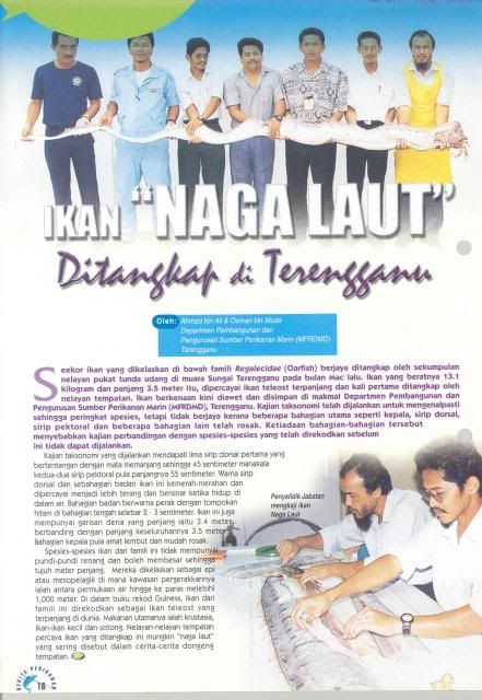 Mungkin ramai yang sudah/pernah melihat ikan ini, tetapi kat oversea,kan,kan.. sebenarnya ikan Oarfish (Regalecus glesne Ascanius) telah ‘pung’ berjaya ditangkap di Muara Sungai Terengganu, Terengganu dengan menggunakan pukat tunda udang. Spesimen ini berukuran 3.5 meter dan seberat 13.1kilogram. Malangnya kajian menyeluruh dan rekod tidak dapat diambil secara terperinci kerana bahagian kepala dan sirip dorsal dan sirip pektoralnya telah rosak.