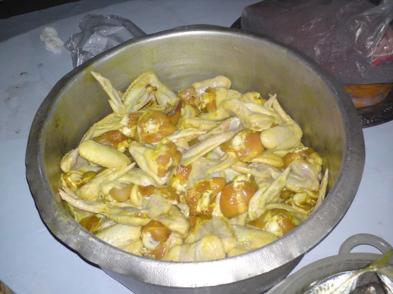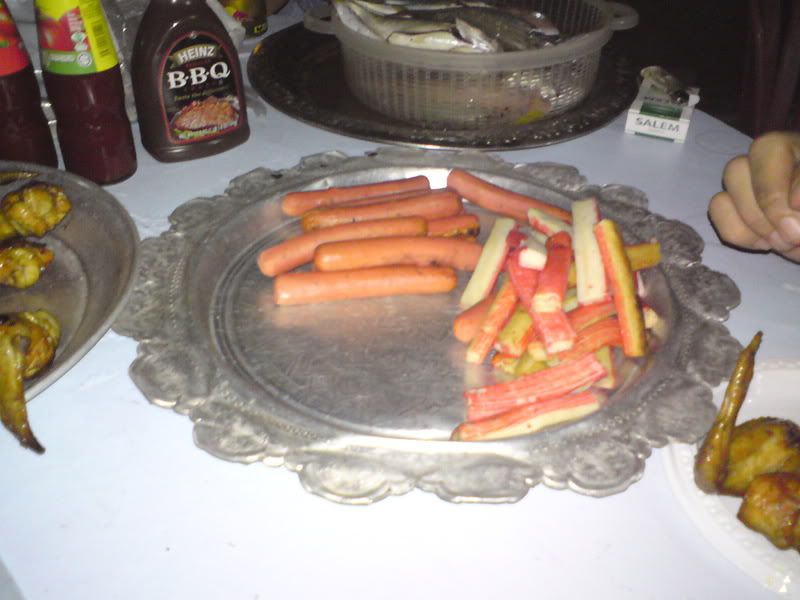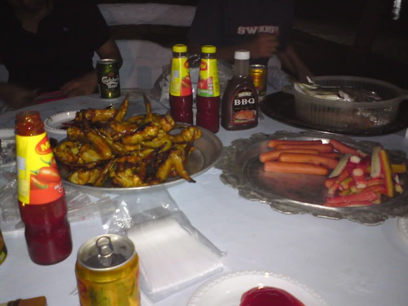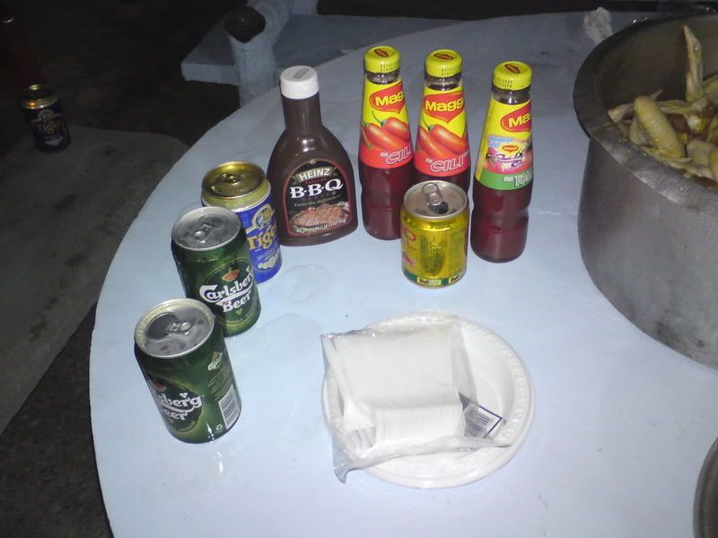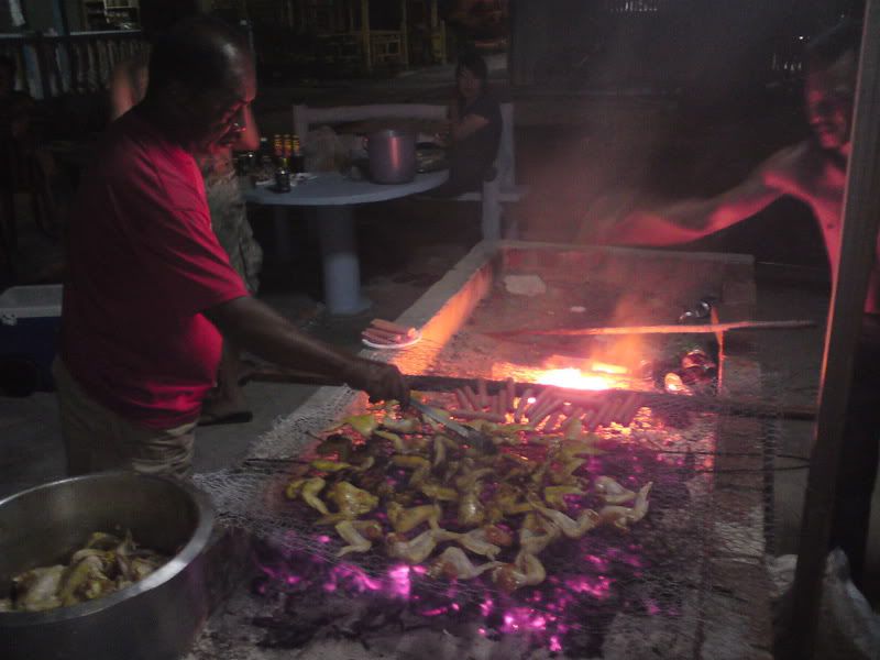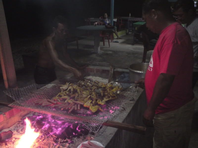 After 1st day fishing, we headed back to chalet about 6.30pm. We bathe n clean ourselves, a BBQ dinner is served to us which we had plan for the birthday gal. Everything is prepared by the villagers there, we only provide them the raw materials n they will do all the seasoning for us n even BBQ for us to eat. The best part is they even set up the fire for us, wat we do is just sit n waited to EAT. BWAHAHAHAHAHA…SI BEH SONG AR… Lets see wat we have here…BTW the sotong are catch when we do edging at the jetty some of them are as big as almost 500-800g :shocked: :shocked: :shocked: