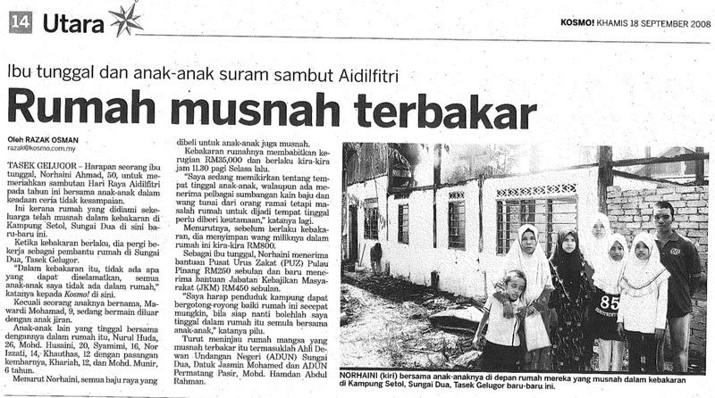 Sebenarnya berita keluarga balu malang dengan 11 orang anak ini yangmana rumah mereka telah hangus terbakar ada disiarkan dlm satu ruangan berita kosmo bertarikh 18/9/2008 baru-baru ini… (Sumber gambar dari posting pacik dlm sembang utara)