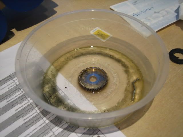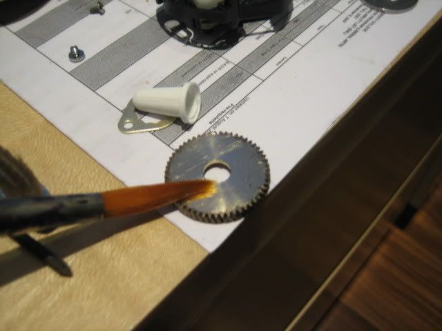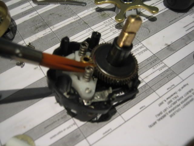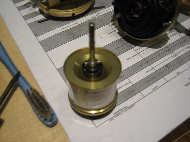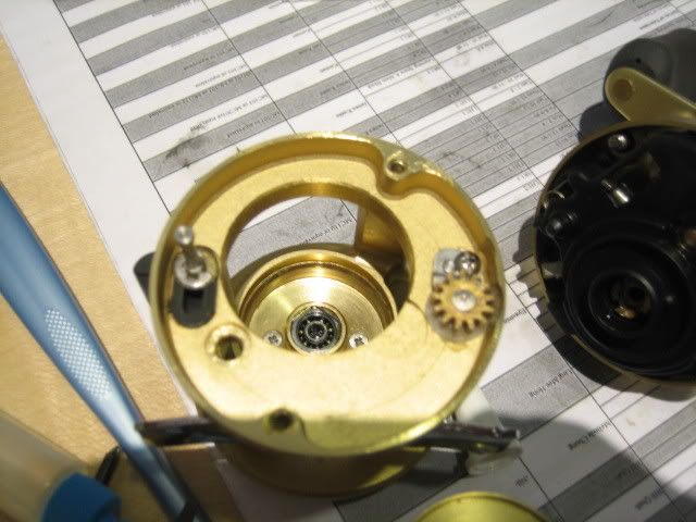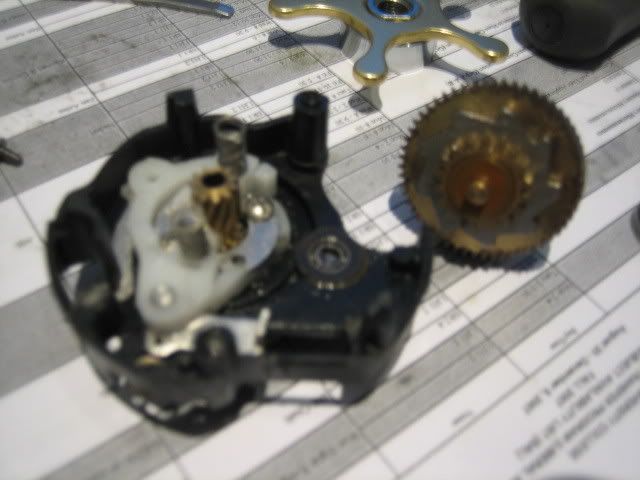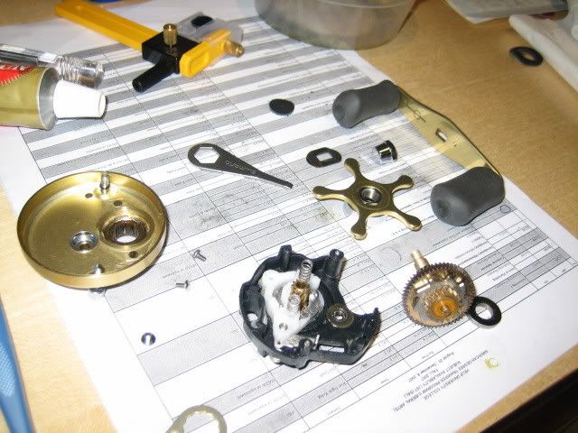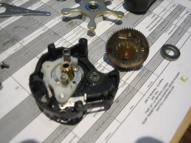 The main shaft fits in this sequence - metal tube for one way bearing - plastic round thing - metal drag cover - drag piece - main gear - small black drag - sharkfin gear (facing left) - small round gear - 2 washers. After taking everything part u should start to degrease everything with a solvent. I use lighter fluid.