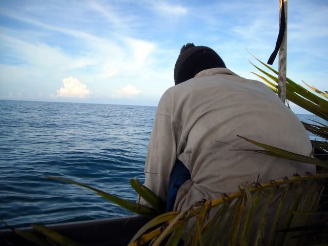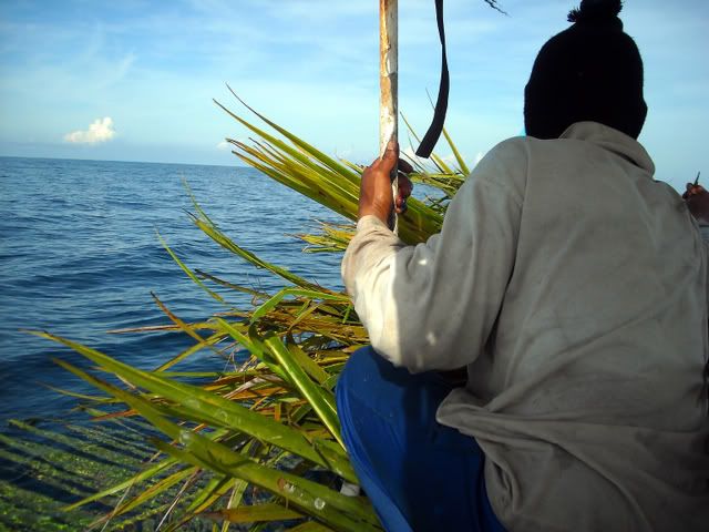 daun kelapa penuh di depan bot… perhatikan 2batang buluh diikat ditepi bot…