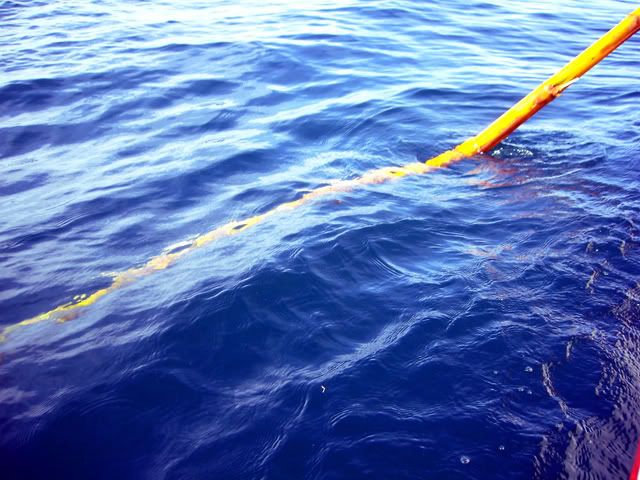 mula2 ikatan buluh dibuka dari bot dan biarkan terapung… ikat hujung tali ke lobang di pangkal buluh… dan lepaskan daun kelapa satu persatu…