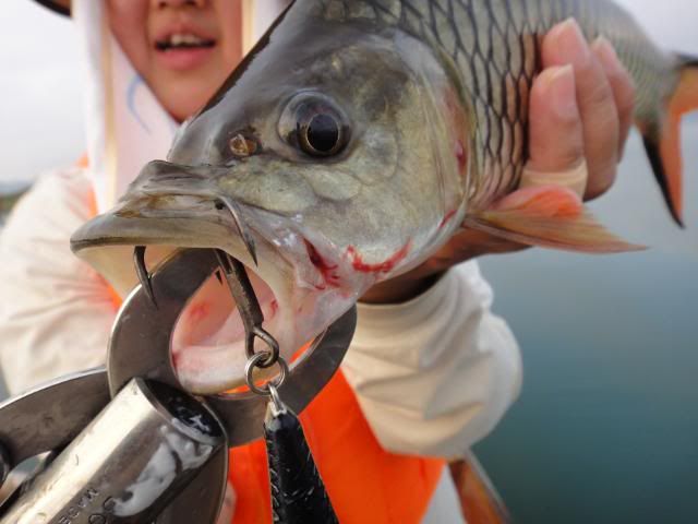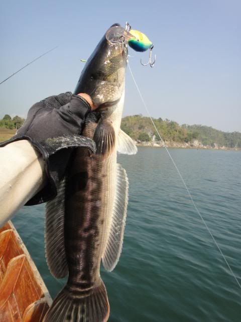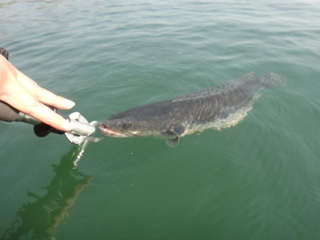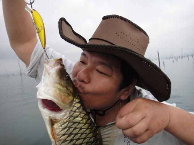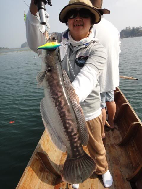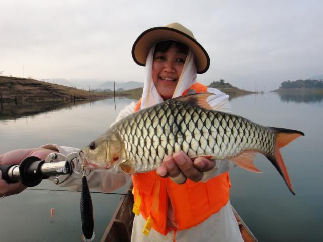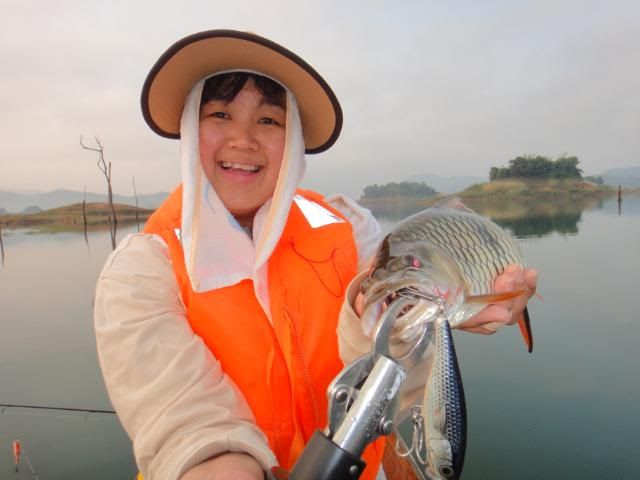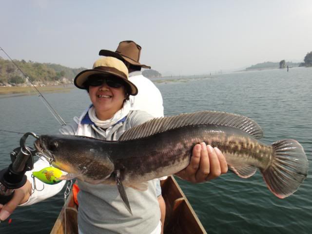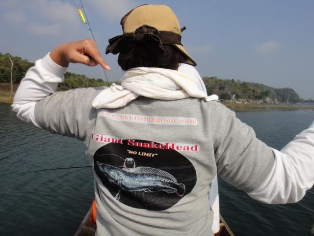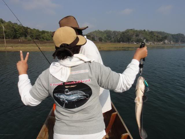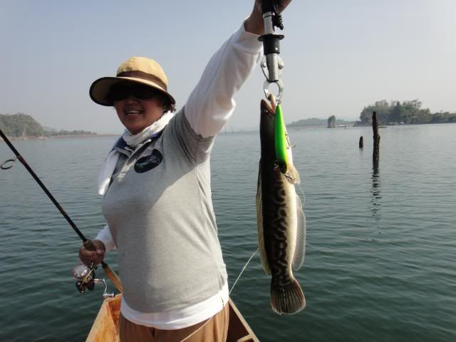 Henry’s wife came without any proper casting or luring skills experience. For the very first day, I’ve tried my best to help and teach her the correct way to cast out her lure , balance on the boat and crank the lure etc. At the end of the fishing trip, she passed with fly color and is fit to wear my Giant Snakehead T- shirt with logo stated " NO LIMIT’ when come to wild fishing. Just work hard and have faith in yourself. The big catch will come one day. ![]()