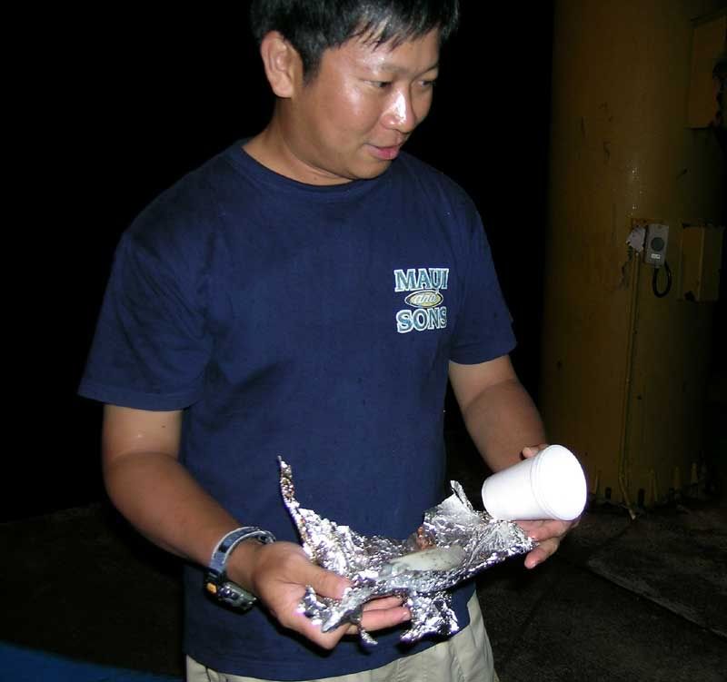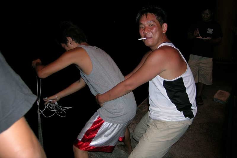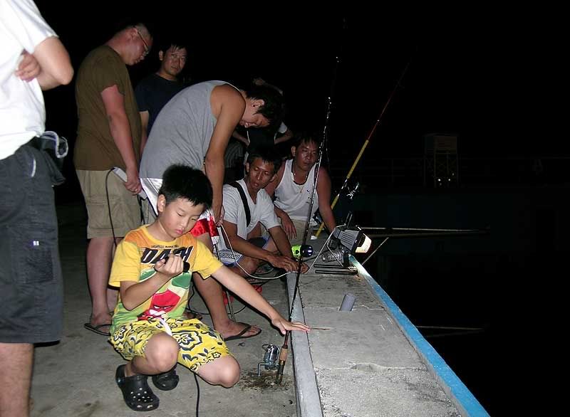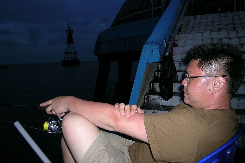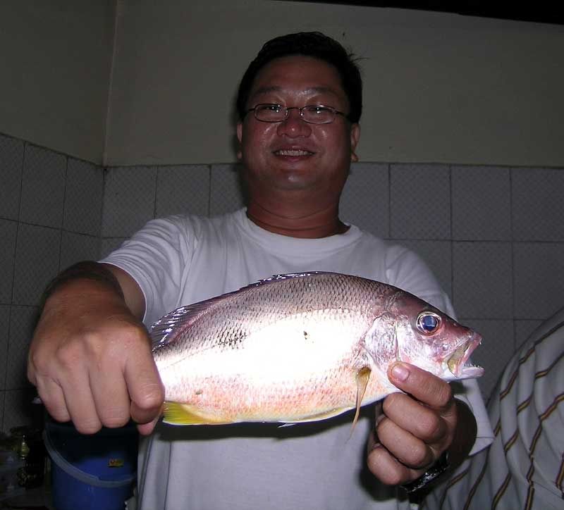 At about 9pm, we took two boats up to the shipwreck to try night fishing. I tried jigging, bottom with whole tamban, but here was absolutely nothing. Maybe the tide was too strong. We were very close to the wreck, and it looked very eerie. After 2 hours, having nothing, we decided to return. I think we should had got some Sotong, it would be better.