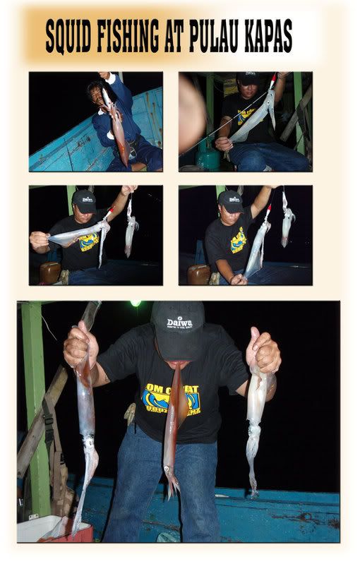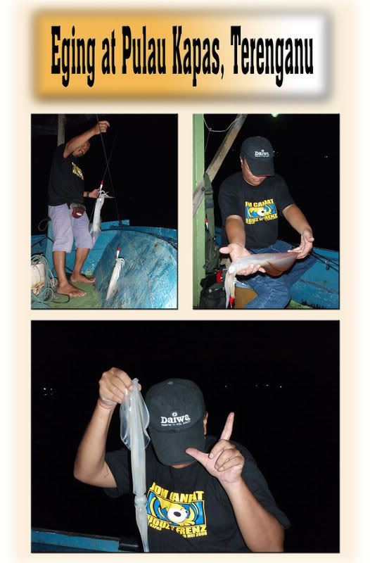 16 Team Budu(MFN) members went Squid Fishing or eging at Pulau Kapas, Terenganu on 17/5/08-18/5/08. This trip, the arrowhead squid that was caught at Pulau Kapas was kinna big, ranging from 6-7 inch to more than a footer type…[:D]