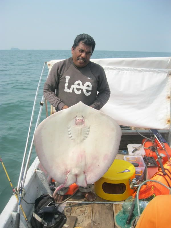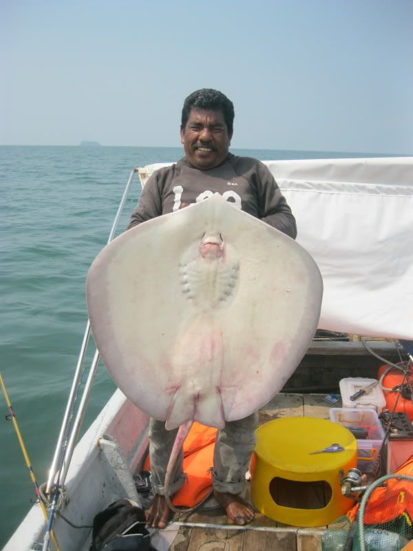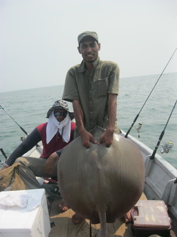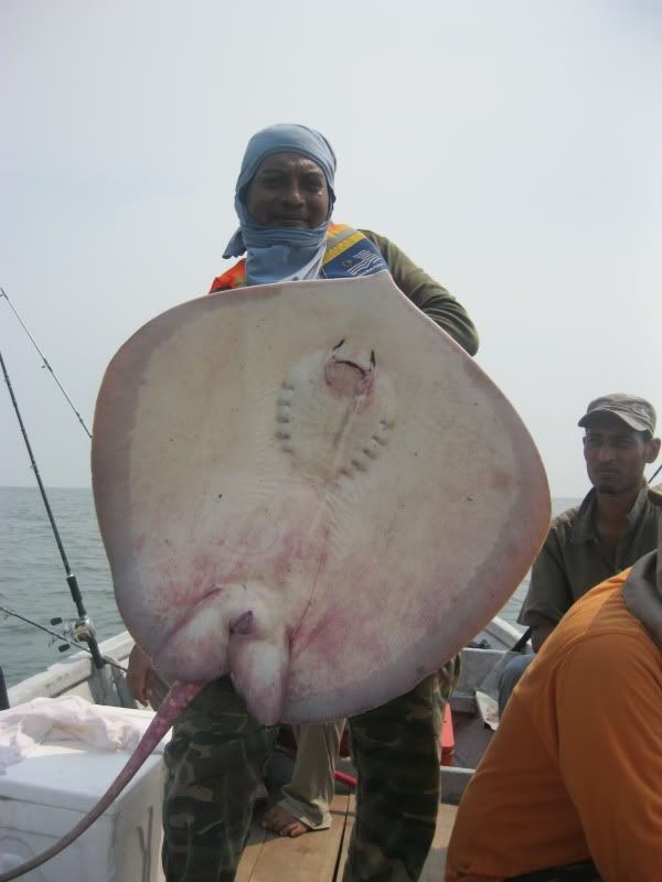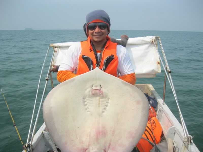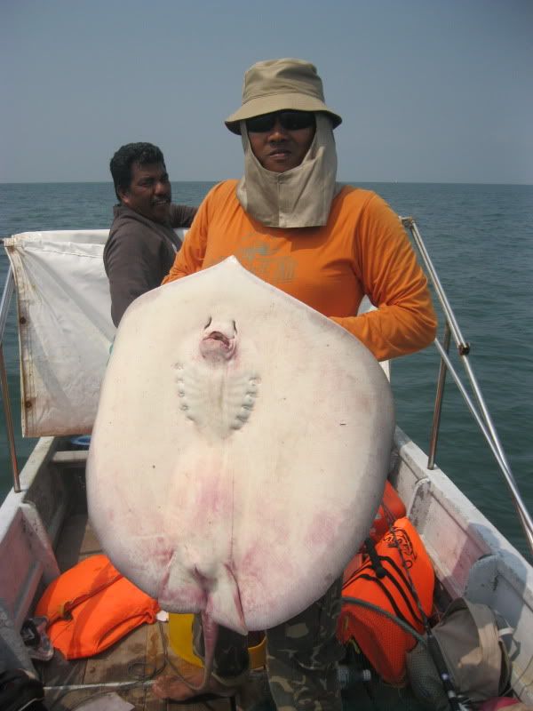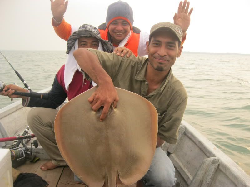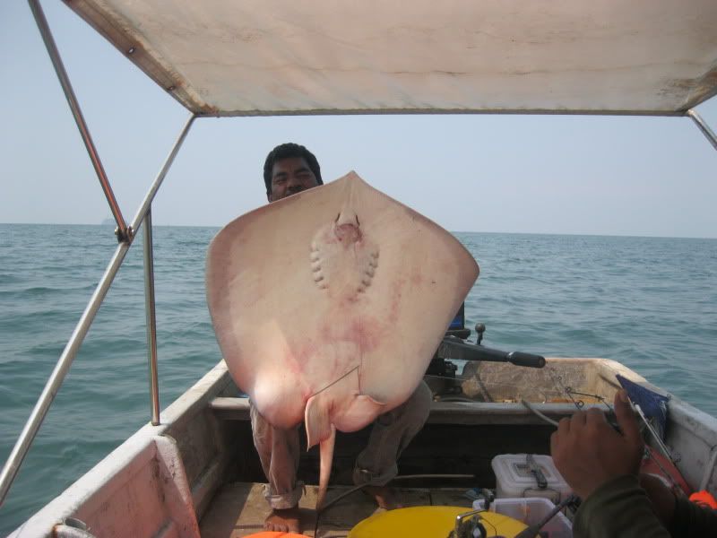 Ady pun turut amik kesempatan utk melelapkn mata. Kami berpindah lagi ke satu lubuk lain. Wak Lu cakap lubuk rahsia beliau. Dia soh ketatkan drag betul2. Aku pun labuhkan umpan, pastu tido di muncung bot. Boring…Selang beberapa ketika, pancing Ady lak menjerit kaw2. Tali beliau hanya 30lb nilon, dn rod serta mesin layak main rohu kolam, telah mendebarkan pundi kemaluan nya sehingga tahap tidak tertahan main line nya yg asik kuar tidak beri peluang. Namun ats kegigihan yg membabi buta itu, selama dlm sekitar 10minit, dia Berjaya menaikkan Pari pertama dlm seumur idupnya berskala 7kg.