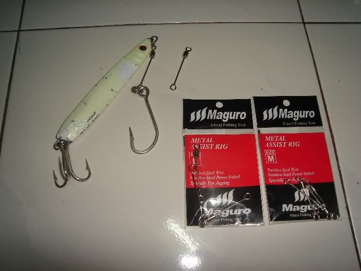 SWLAB, OCEAN KING, STRIKE PRO AND MANY OTHERS. I stocked until I could hardly breathe already. Those ASSIST METAL WIRE WITH SWIVEL also got. Beside the surecatch jigs (as shown in picture) there are also equivalent range from white rabbit, bluefox, williamson with full flourescent very good for night jigging for tengirri. Please let me know the size (gm) you want. Kindly e mail me. Thanks!!
