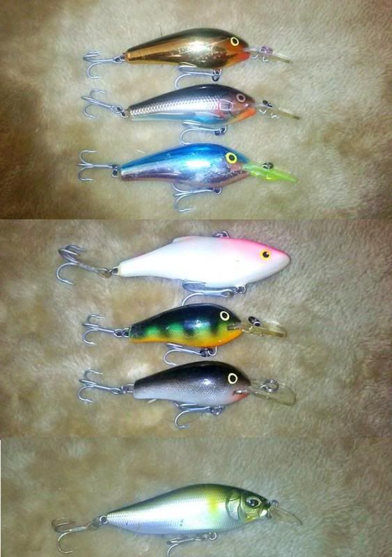 Dari atas : Rapala Rattlin’ Fat Rap RFR7 3 ekor, Rapala Rattlin’ RNR8 Japan Special seekor, Rapala Fat Rap FR5 2 ekor dan bawah skali Megabass Flap Slap