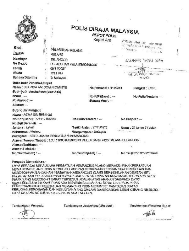Salam Sejahtera semua, saya baru balik dari Pengkalan Persatuan Memancing Klang. 2 wartawan telah hadir untuk mengambil butir-2 robohan itu dan didapati Pengusaha itu tidak memberi sebarang amaran atau notis untuk ahli-2 persatuan itu memindah. Pengusaha itu tidak memberi sebarang pampasan atau pun bantuan kepada persatuan itu. Persatuan Memancing Klang mempunyai lebih dari 100 ahli(beserta sampan yg parking di situ). Mereka juga telah lapur pencerobohan dam robohan pengkalan itu kepada pihak police…[|)]